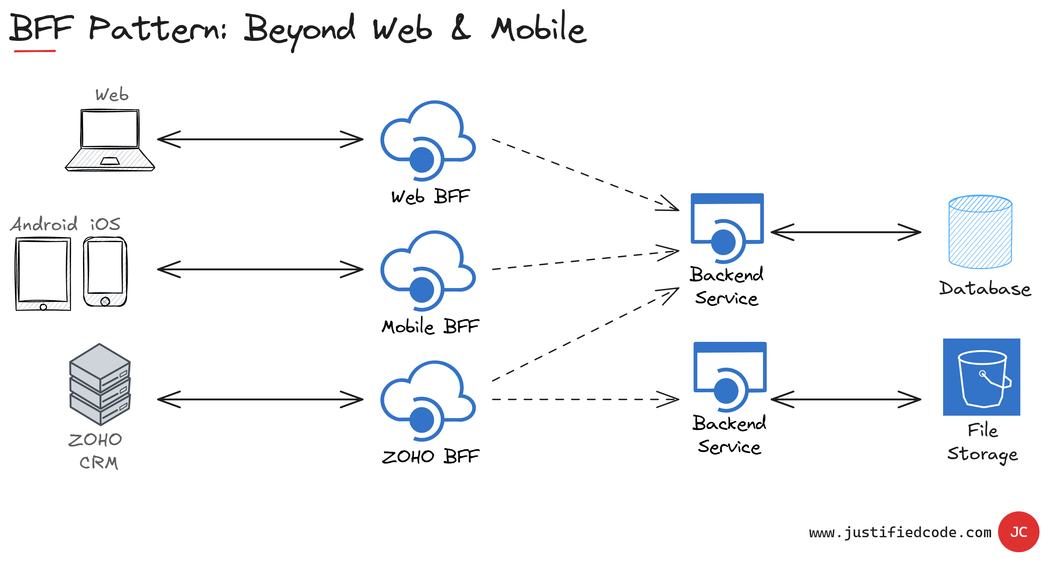This pattern isn’t just about browsers and phones. Hook in third-party systems like Zoho CRM? Yep, you can give them their own BFF too ↓. Each interface gets exactly what it needs without messing with others.