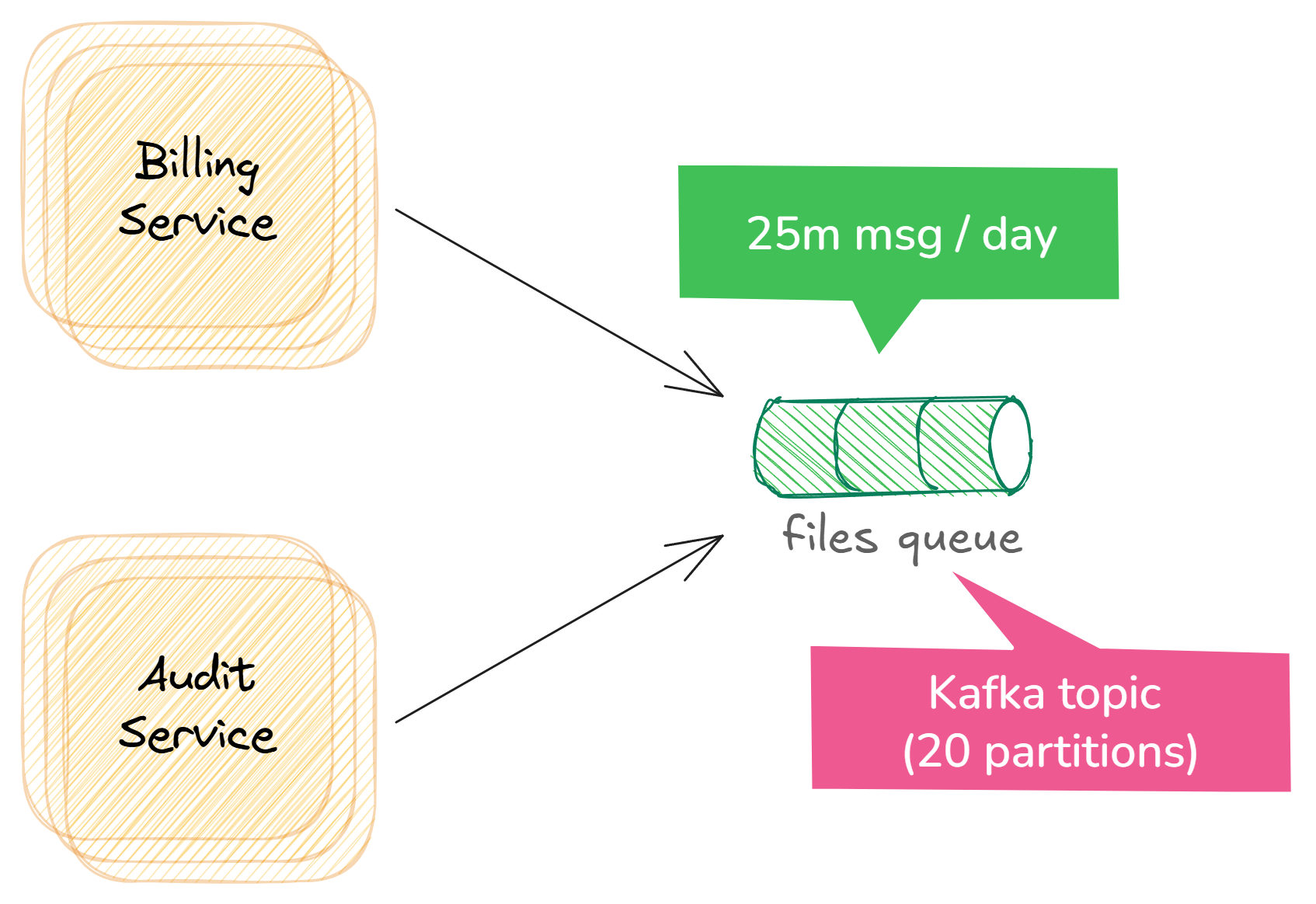 We developed a service responsible for consuming these messages and uploading each file to Google Cloud Storage. The service was deployed in Kubernetes cluster on premises with 1 docker pod, and 20 consumer threads.