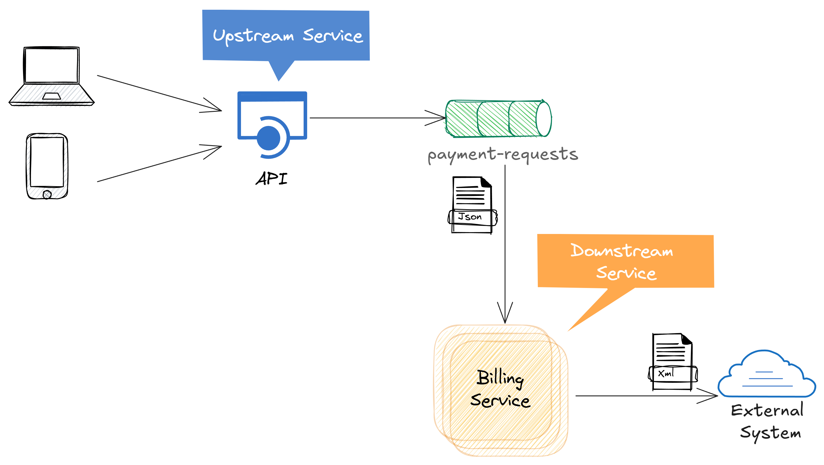 An upstream service receives orders from clients through an API and publishes a JSON message to a Kafka topic called payment-requests. A billing service consumes that message, converts the JSON into an XML format, and sends the request to an external system.