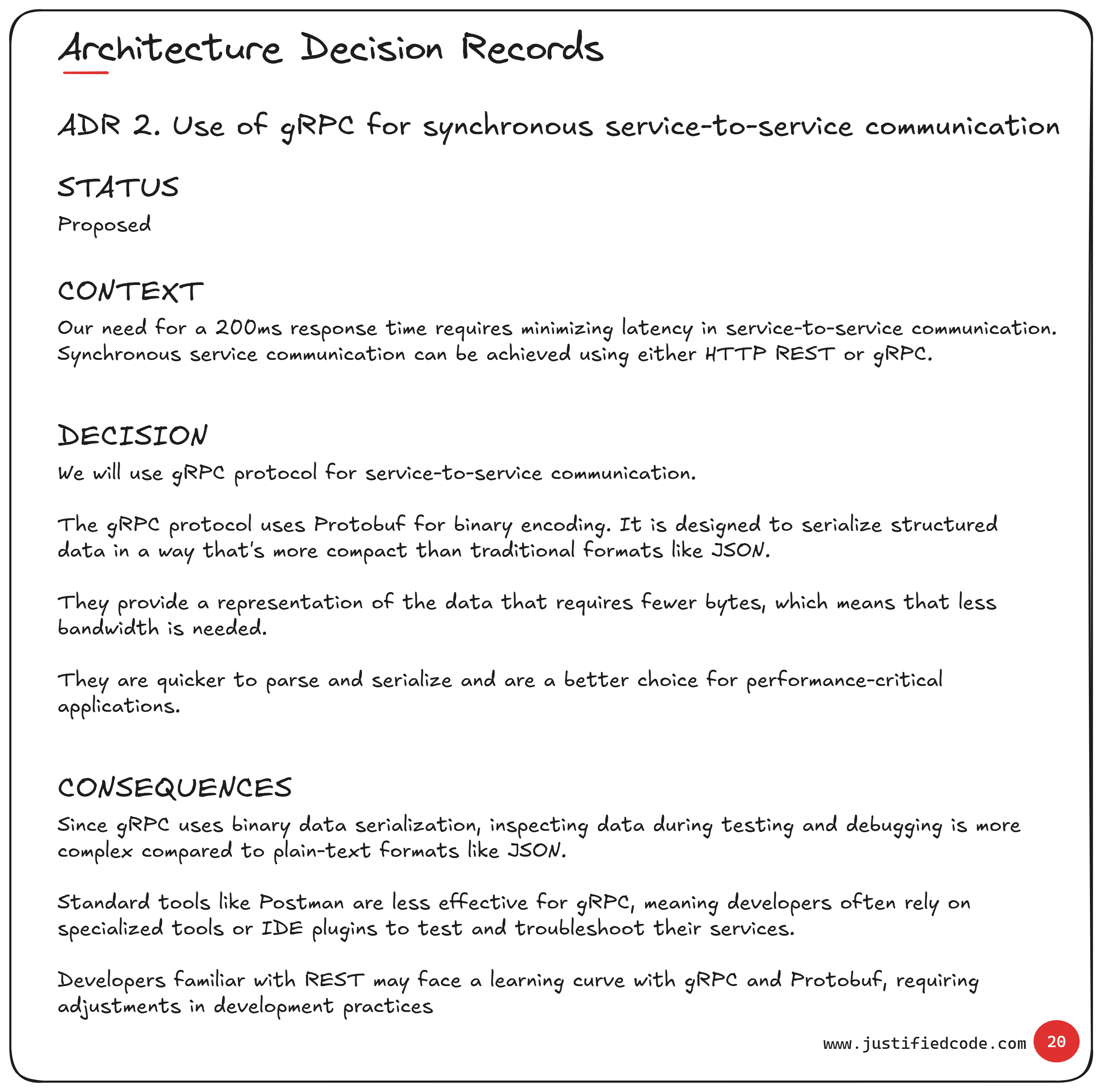 By recording the decision, we ensure any future team members understand why gRPC was selected, how it met our performance goals, and what trade-offs were accepted.