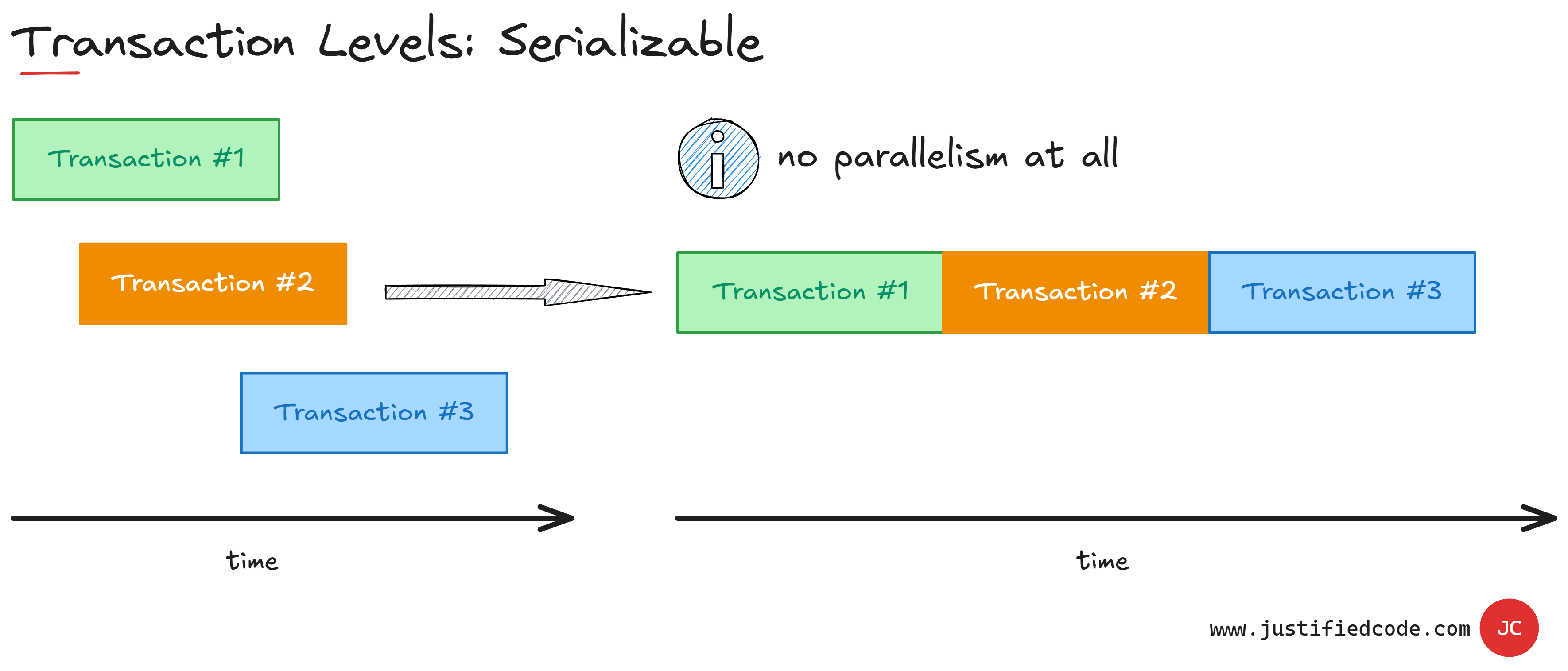 The most isolated transaction level is called serializable. It means that all the transactions are done as if they were issued one after another, without any parallel operations.
