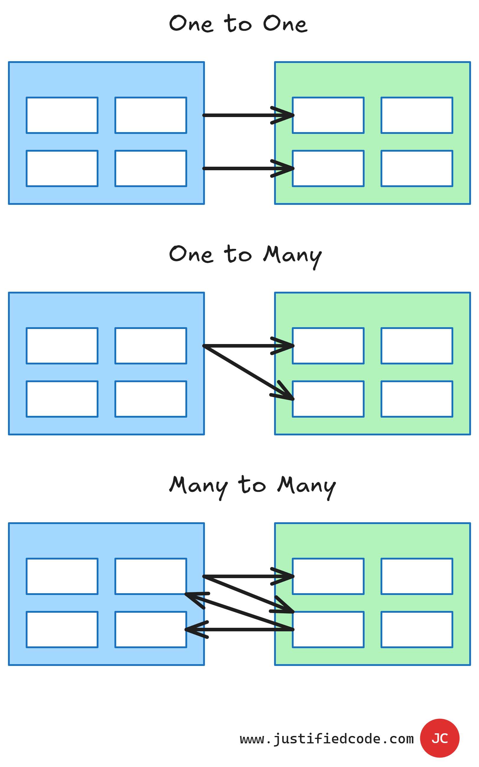 The rows are also called records. The tables themselves can form relationships between the columns in a single table or between different tables. There can be one to one relationships, one to many relationships, or many to many relationships. Here is an image to illustrate this.