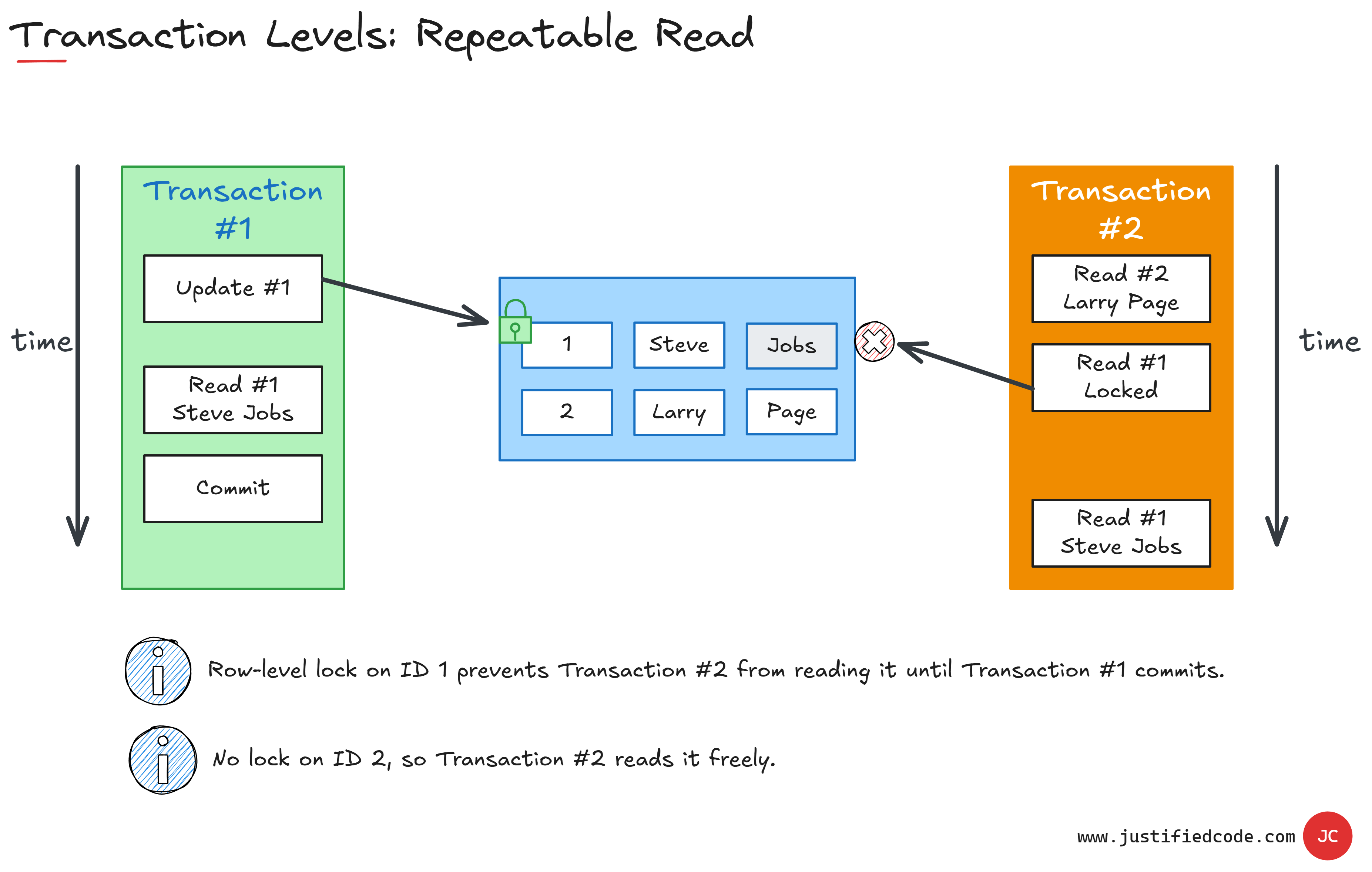 As its name reveals, it ensures that if we read twice during a transaction we will have two identical reads. In this case the second transaction, orange, read operation #2 is allowed to be processed, but the read operation #1 is locked. It's delayed until the first transaction, the green one, has finished and thus released its lock on the row.