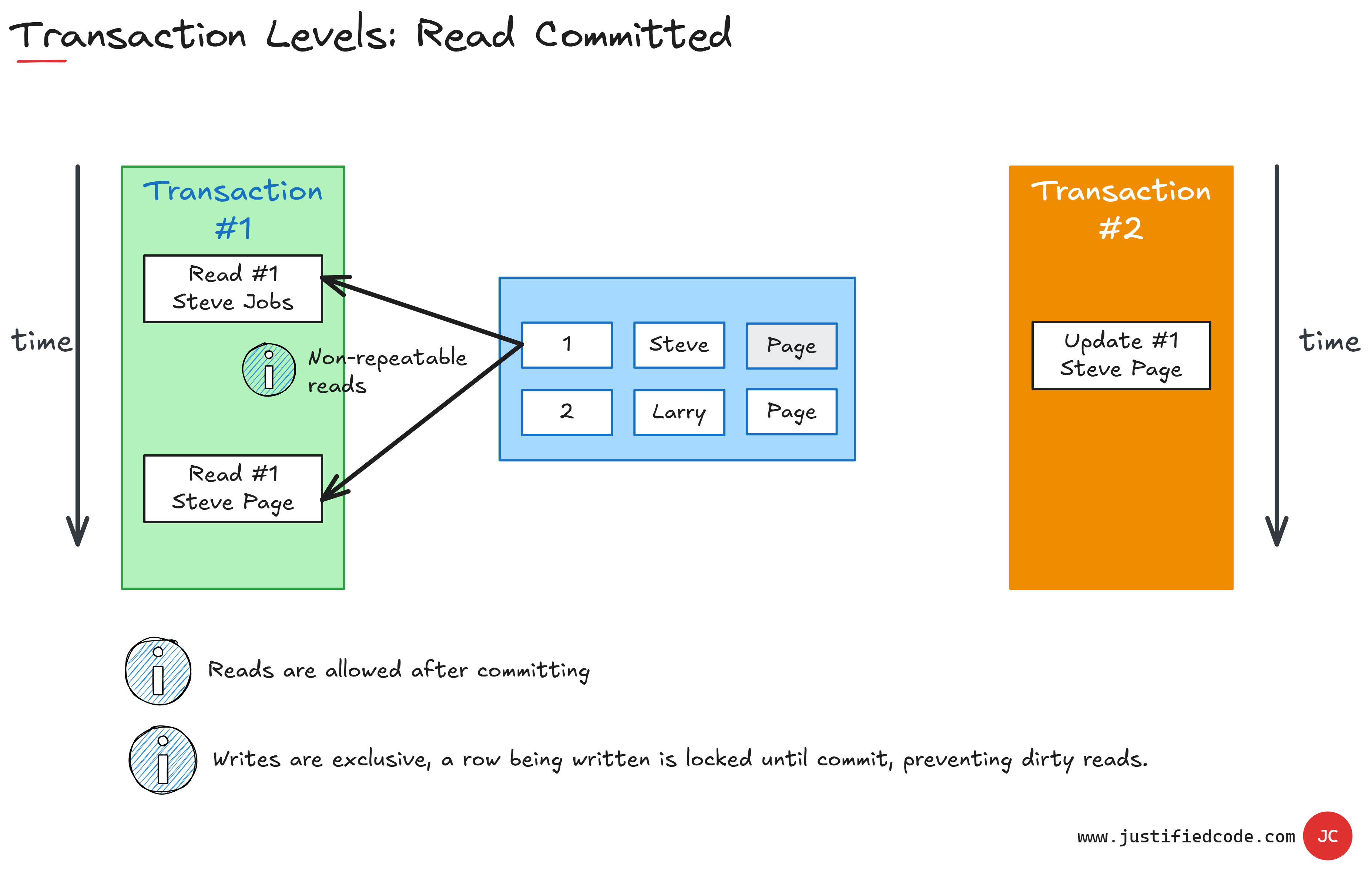 Write operations are still exclusive to a single transaction at a time, but we cannot guarantee repeatable reads during the transaction. Then transaction can begin and finish between the reads. So in this case we have read two different values for the row #1 because there was one orange transaction #2 in the middle of transaction #1.
