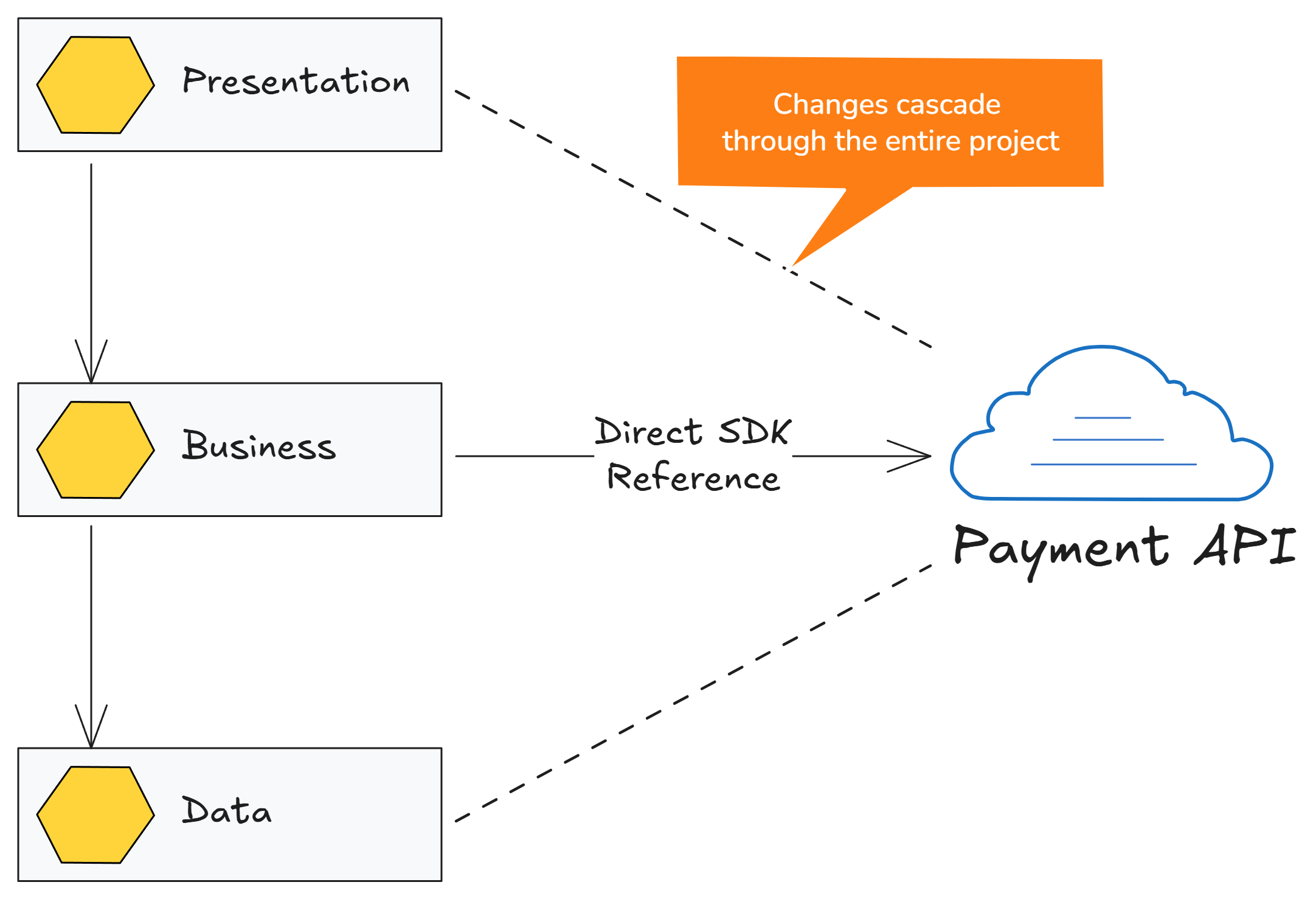 This creates a dependency where any change in the SDK forces updates across all project layers. Imagine having to rebuild and redeploy your entire application just because the payment gateway updated its API.