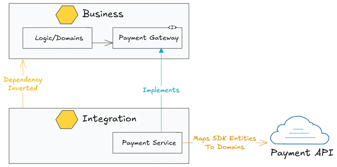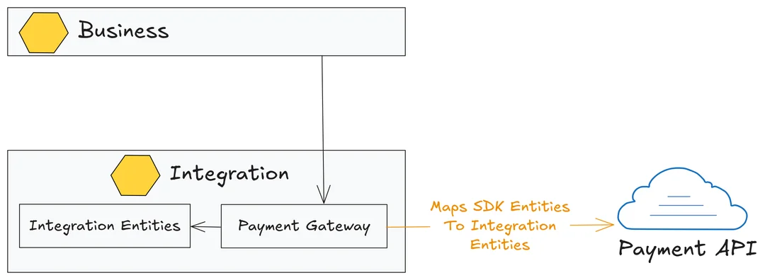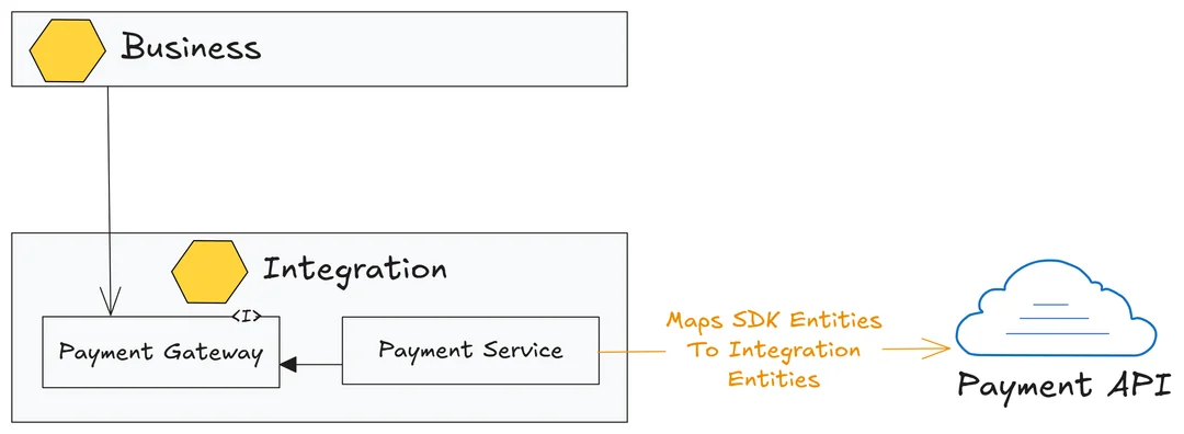 The integration service logic maps the payment SDK entities to our domain entities that reside in the business layer. This design allows the integration component to function as a plugin—easily swappable.