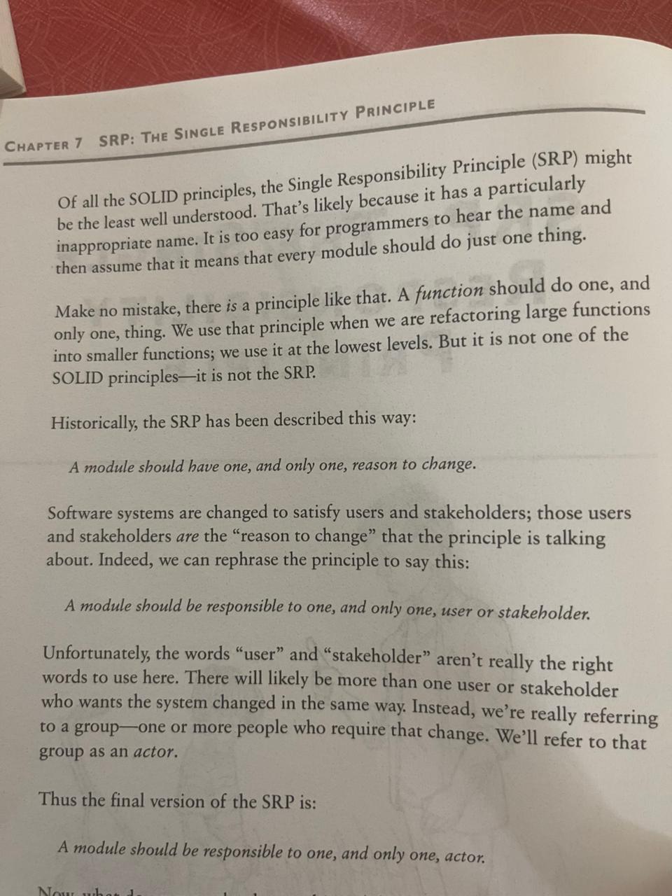 The most ambiguous part is S. Most people think it means a class should do one thing. This confusion is reinforced by Clean Code, where the same author says code should do one thing and do it well. What becomes clear when reading Clean Architecture book is that S is not a code-level thing.