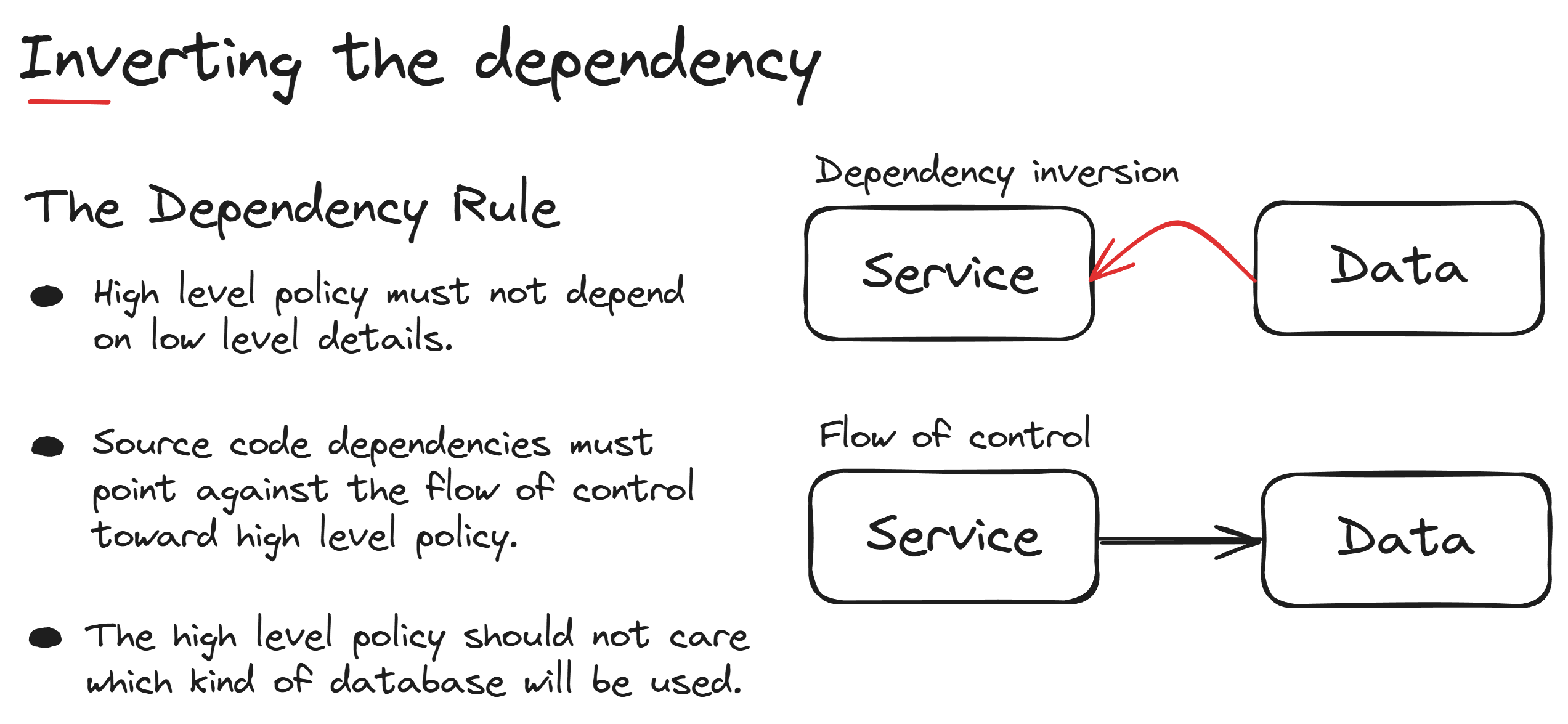 The idea should start with D. Inverting the dependencies or, the dependency rule. High-level policy must not depend on low-level details.