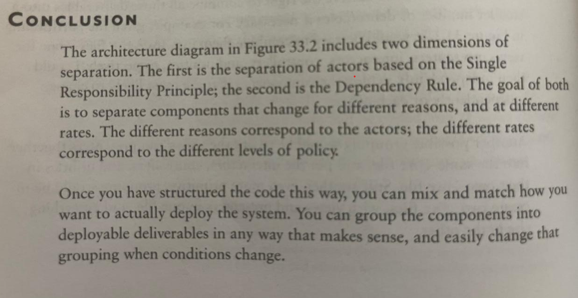 A component should have a single reason to change, which means aligning it with one source of change. This is about deciding what assemblies or libraries your system should have so work does not get intermingled across teams.