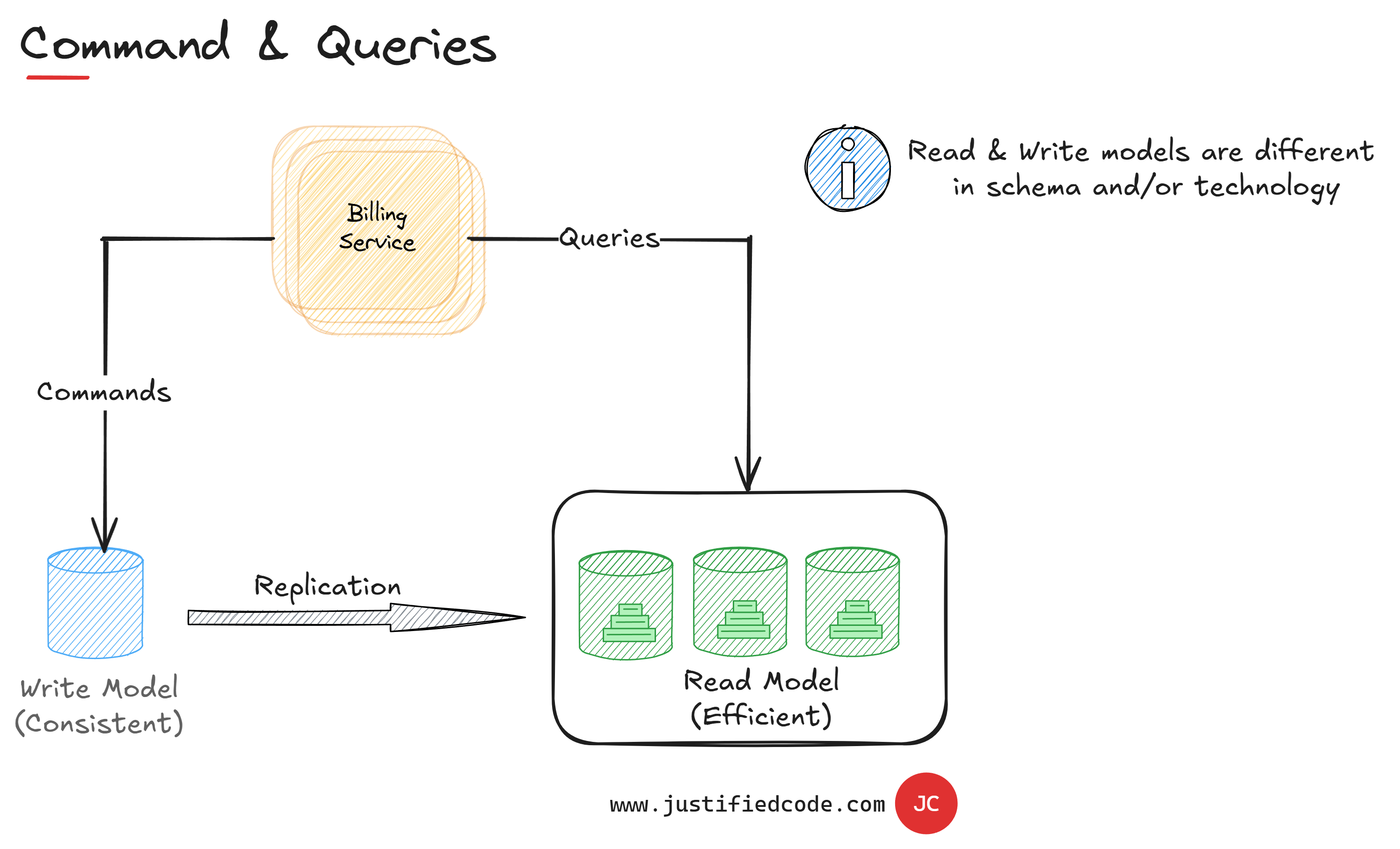 As its name indicates, it segregates the responsibilities of commands and queries. Commands are concrete objects that encapsulate intents of changing the data in the write model. While the queries are read-only data operations on the read model.