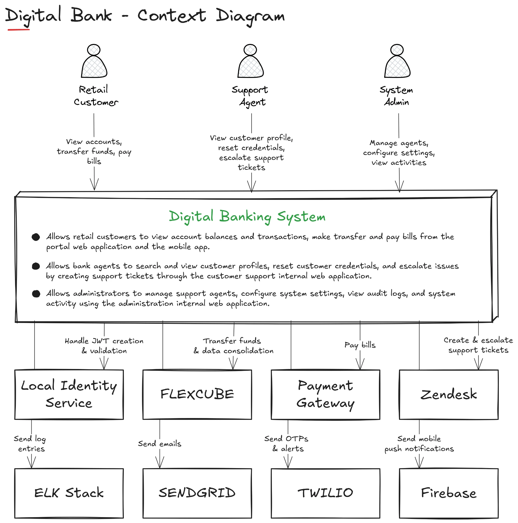 Draw your system as a box in the center, surrounded by its users and the other systems it interacts with.