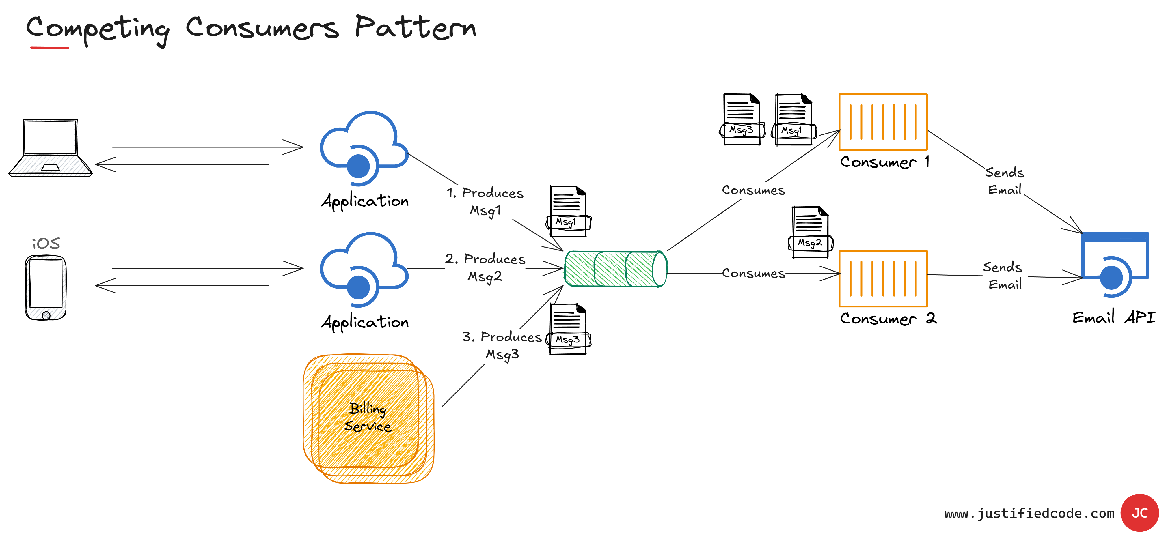To handle high load, you add more consumers. Each consumer pulls from the same queue. They “compete” for messages, so no single instance becomes a bottleneck.