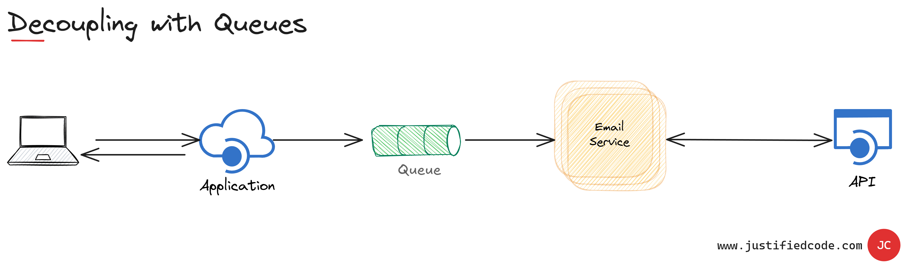 Instead of direct calls, the application sends requests to a queue. The consuming service processes messages from the queue at its own pace.