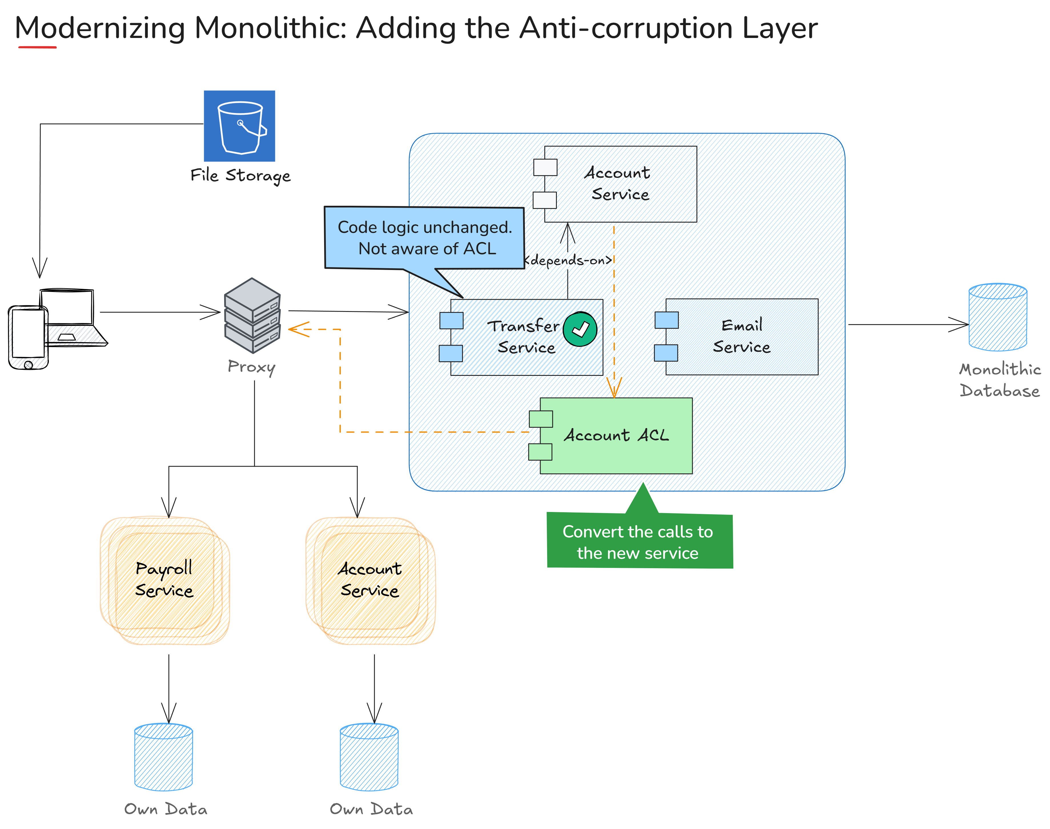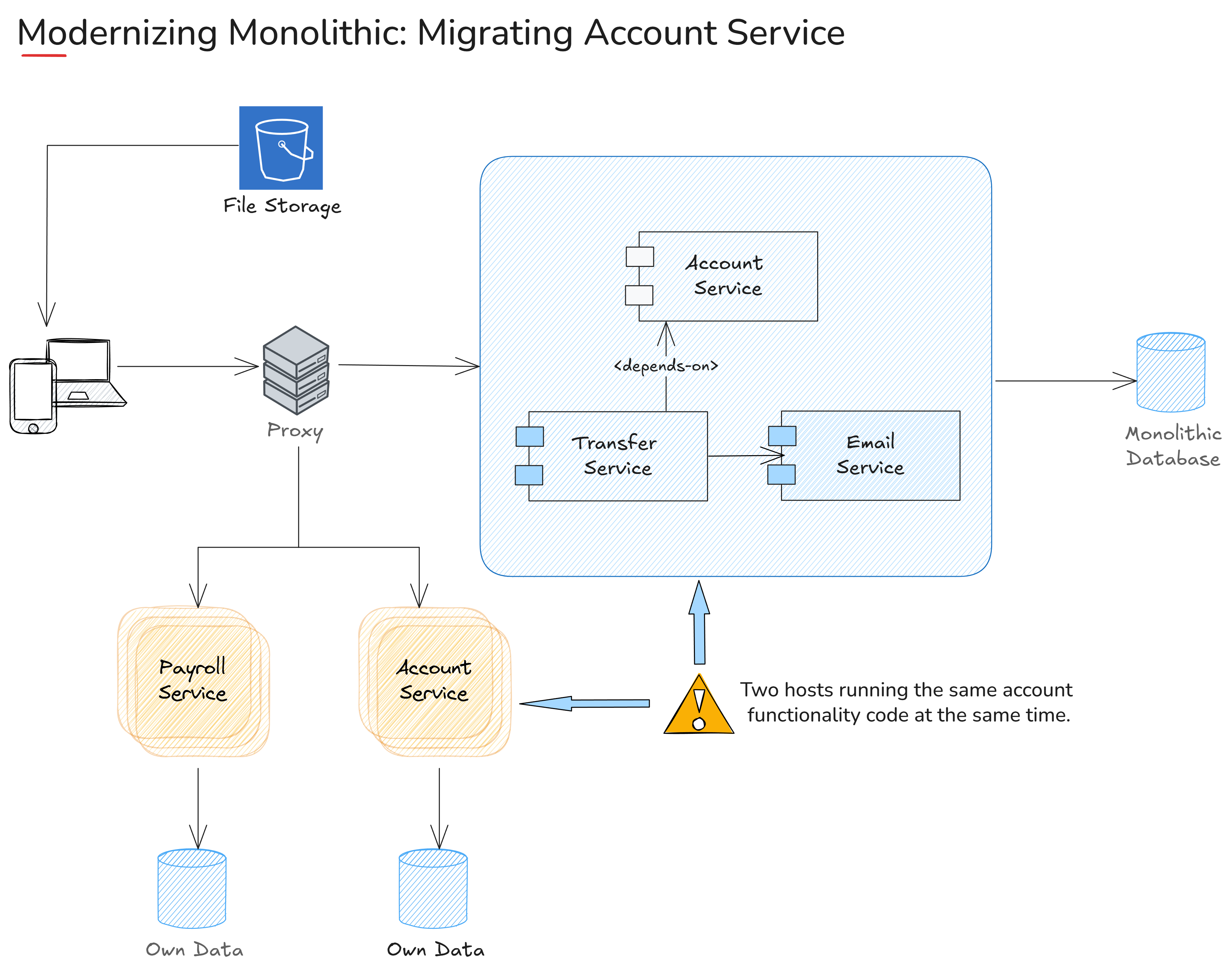 Now select one domain (Account) function inside the monolith and move it out along with the data it owns. You do not touch the monolith code yet.