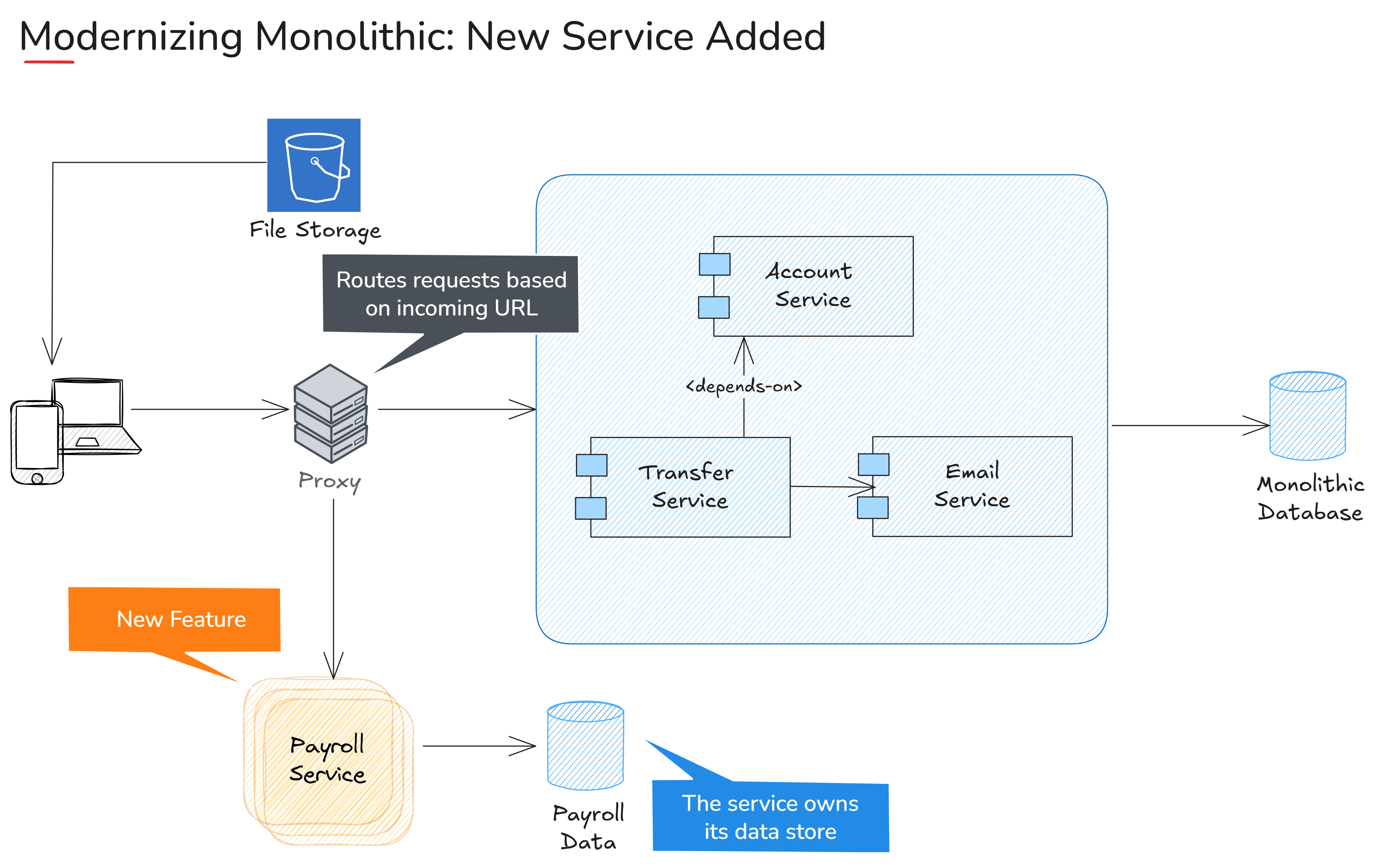 New features are not added to the existing monolith. You implement them as a new service (Payroll). Meanwhile, you continue fixing bugs in the monolith.