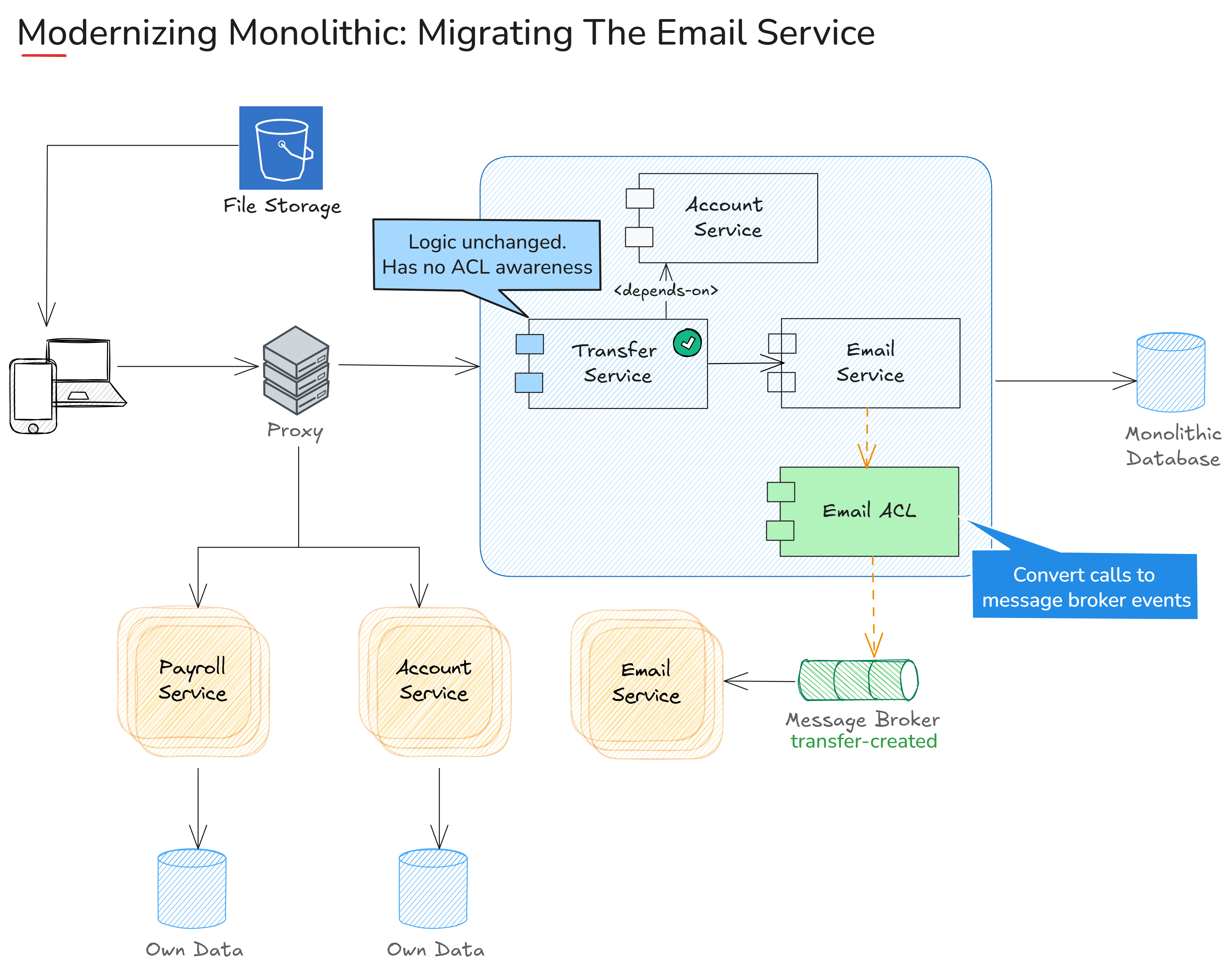 It is time now to migrate the Email service following the same ACL approach. The difference here is that we decided to write email requests as message broker events. The legacy way of doing that is to directly contact a local SMTP server.