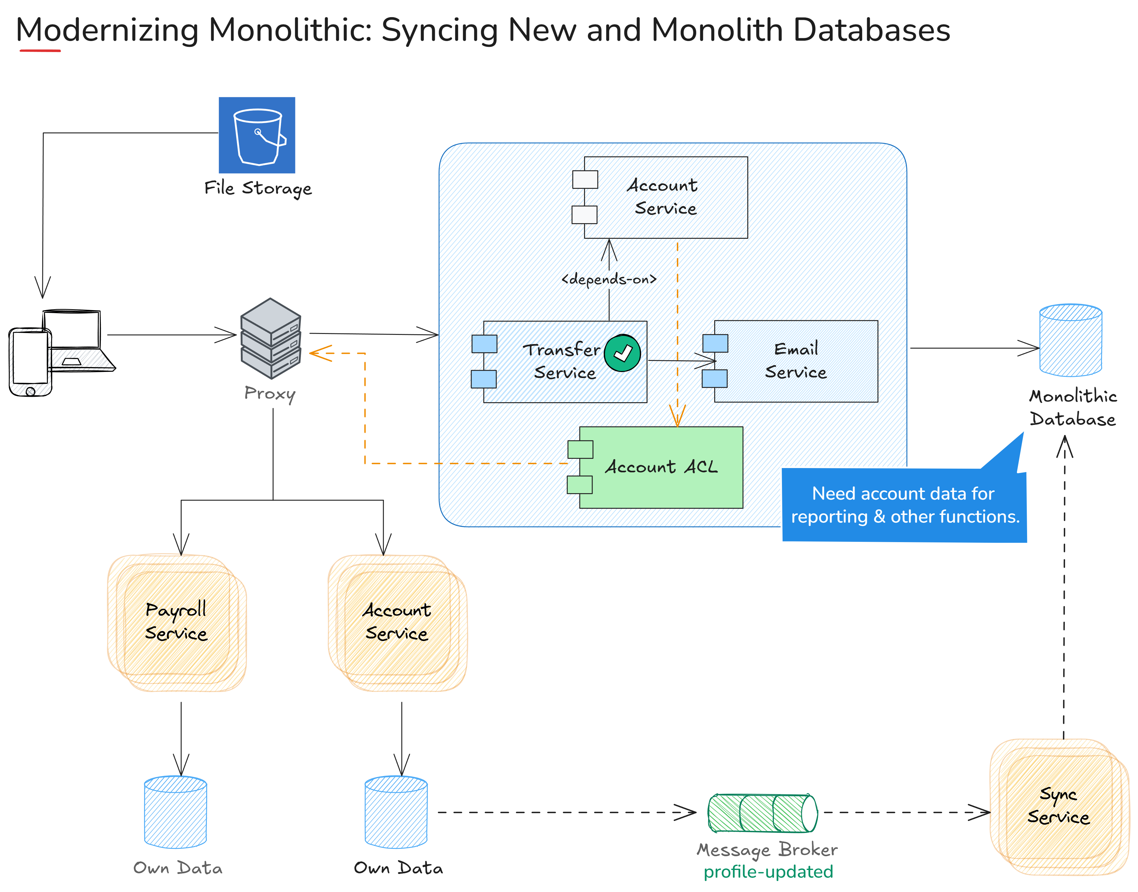 Modern services own their data, which means the account service stores its data in its own data store. The problem now is that existing legacy systems might need that same data for reporting and other functions.