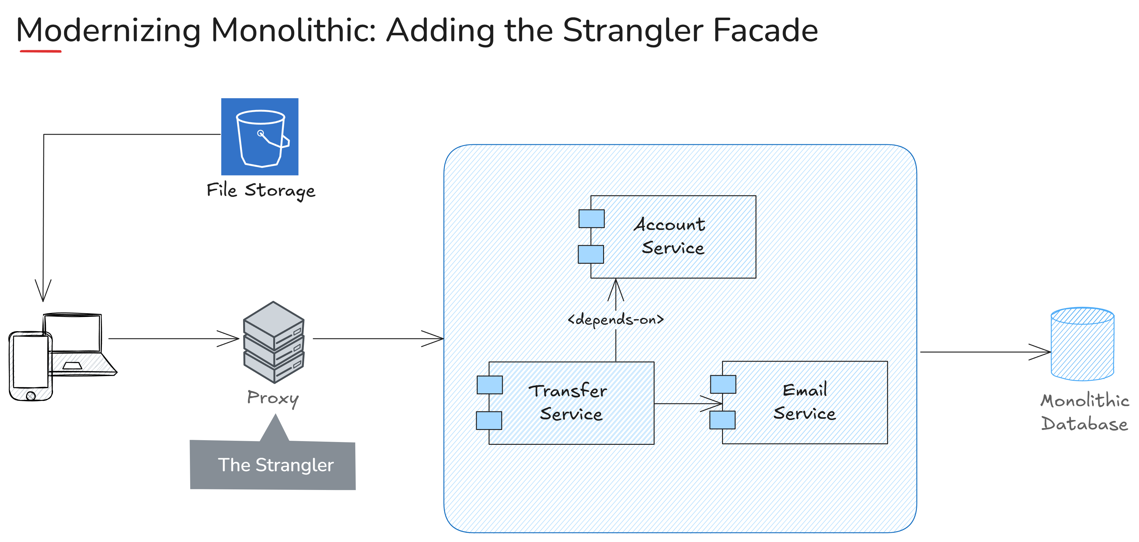 The first step in the strangler fig pattern is to add a strangler in front of the monolith. At the start, the strangler (proxy) routes all traffic to the monolithic application.